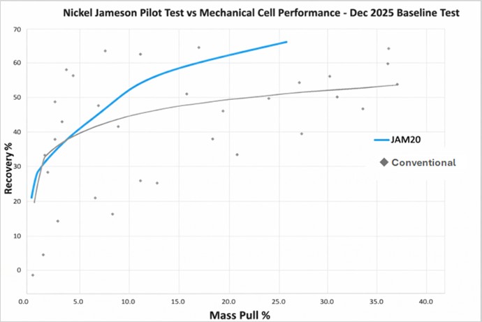 - PGM recoveries improved by 5 - 10% while nickel improved 5 - 30% above baseline conventional cell recoveries, while mass pull reduced by up to 50% - See Figures 1 and 2.
