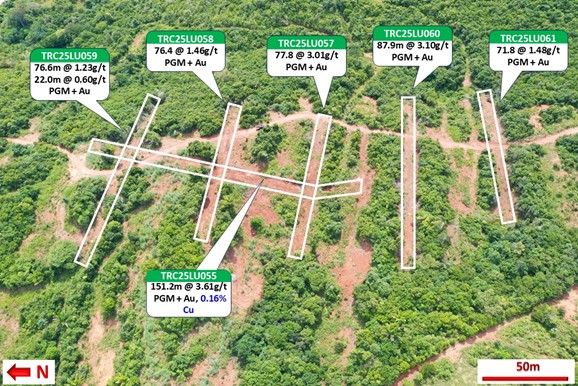As previously observed in nearby trench TRC23LU021, which returned 79m at 3.65g/t PGM+Au with Au at 0.13 g/t Au, and including 22m at 9.4g/t PGM+Au with Au at 0.43 g/t Au (see news release dated September 26, 2023), trenches TRC25LU055 and 057 also returned gold grades that are multiple times higher than those observed elsewhere at Luanga, and comparable to or exceeding the higher gold grades initially encountered in TRC023LU021. Trench TRC25LU055 also returned highly anomalous associated copper values.